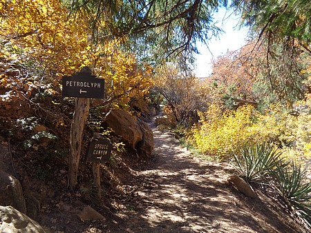 We zijn gestopt bij Chapin Mesa, hier is een museum en bookstore. Ook een cafe en winkeltje (heel duur) en hier hebben we op het terras koffie/chocomel gedronken en onze broodjes opgegeten. Hier ligt ook het Spruce Tree House. De trail er naar toe was gesloten vanwege reparaties aan het pad, maar je kun het prima zien liggen vanaf de overkant. We besloten toen om de Petroglyph Point Trail te lopen, dit was heel erg mooi maar er zaten ook een paar spannende stukken in: een smalle "tunnel" onder een rotsblok door, net breed genoeg voor een halve persoon en even later een soort van trapje tussen rotsen, ook een halve persoon breed. Onder overhangende rotsen en heel veel moeilijk lopen, maar wel mooi. We passeerden een ouder stel die zaten te rusten. Even daarna hoorde ik commotie en het bleek dat die man veel te snel was gaan lopen, struikelde over een tak en omdat hij naar beneden zou vallen, greep hij zich vast aan Jacky, die ook viel en bijna vielen ze samen de canyon in. Emma hield ze nog tegen. Al met al had Jacky een pijnlijke arm en knie en we hadden zoiets van, nu is het genoeg en we zijn omgedraaid. Een ongeluk is héél snel gebeurd. Als Jacky er niet was geweest dan was die man naar onder gesodemieterd. We hebben een mooi stukje gelopen en eigenlijk was de afstand ook wel genoeg. Voor deze trail stond twee uur op het bord, maar dat zou niet genoeg zijn. Maar vooral, de schrik zat er goed in bij ons.