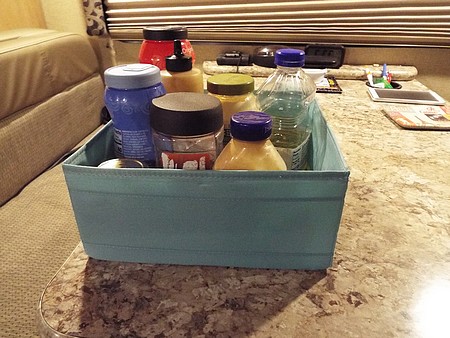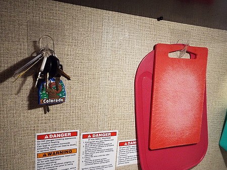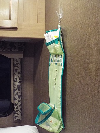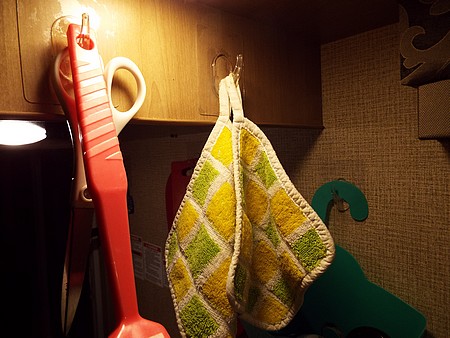 bergen in de grote bergruimte onderin de wagen. De glazen plaat die over het fornuis ging was bij onze camper niet aanwezig, Colton zei het al, die sneuvelen als eerste. Dat betekende dat we praktische geen werkruimte hadden. We hebben dat mooi opgelost door een hele grote plastic snijplank goedkoop te kopen, die paste precies op het fornuis. Dat ding staat nu bij ons thuis in de keuken. Wat handig was en mee naar huis kon is ook meegegaan. We hadden ook onze eigen campingstoeltjes meegenomen, die stonden hier al jaren stof te verzamelen en nu kwamen ze van pas. Ze zijn op de laatste camping achtergebleven. Een volgende keer zouden we geen kits meer huren, we hebben veel gekocht wat wij wel gebruiken en veel niet gebruikt waar we wel huur voor hebben betaald. Het scheelt ons dat geld maar ook opbergruimte, alles wat we niet gebruikten lag onderin de grote bergruimte in die dozen. Tja. Nergens een haakje te vinden, gelukkig had Jacky via een website van die plakhaakjes gekocht, 10 haken voor € 2, en die hebben we allemaal gebruikt: voor de vesten, in de keuken voor pannenlappen, een bakje voor de kruiden en afwasmiddel, de schaar, etc., in de "slaapkamer" voor 2 bakjes met potjes, tubetjes, zakdoek etc. Ideaal!!!! De beste investering ooit. En ze kwamen weer perfect van de muur/kastjes af, niks beschadigd.