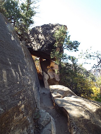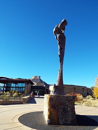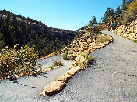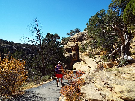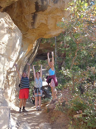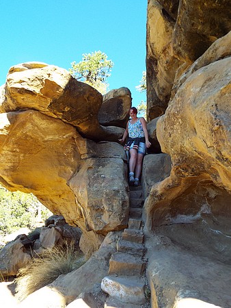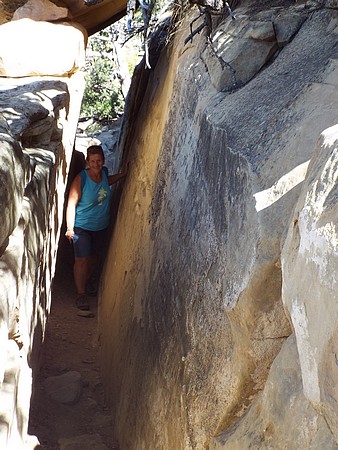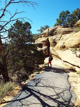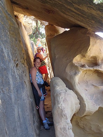 We zijn gestopt bij Chapin Mesa, hier is een museum en bookstore. Ook een cafe en winkeltje (heel duur) en hier hebben we op het terras koffie/chocomel gedronken en onze broodjes opgegeten. Hier ligt ook het Spruce Tree House. De trail er naar toe was gesloten vanwege reparaties aan het pad, maar je kun het prima zien liggen vanaf de overkant. We besloten toen om de Petroglyph Point Trail te lopen, dit was heel erg mooi maar er zaten ook een paar spannende stukken in: een smalle "tunnel" onder een rotsblok door, net breed genoeg voor een halve persoon en even later een soort van trapje tussen rotsen, ook een halve persoon breed. Onder overhangende rotsen en heel veel moeilijk lopen, maar wel mooi. We passeerden een ouder stel die zaten te rusten. Even daarna hoorde ik commotie en het bleek dat die man veel te snel was gaan lopen, struikelde over een tak en omdat hij naar beneden zou vallen, greep hij zich vast aan Jacky, die ook viel en bijna vielen ze samen de canyon in. Emma hield ze nog tegen. Al met al had Jacky een pijnlijke arm en knie en we hadden zoiets van, nu is het genoeg en we zijn omgedraaid. Een ongeluk is héél snel gebeurd. Als Jacky er niet was geweest dan was die man naar onder gesodemieterd. We hebben een mooi stukje gelopen en eigenlijk was de afstand ook wel genoeg. Voor deze trail stond twee uur op het bord, maar dat zou niet genoeg zijn. Maar vooral, de schrik zat er goed in bij ons.