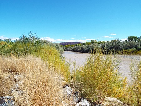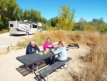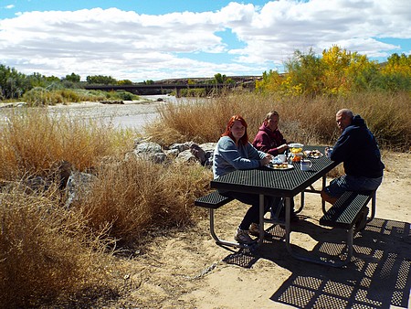 We wilden ook wel wat eten en net ten zuiden van Bluff ligt Sand Island campground, die hadden we al eens uitgezocht, maar dit is ook een first come first serve, en dan weet je het nooit. We hebben over de camping gereden en er stond helemaal niemand. Maar wat een mooie camping! We wilden picknicken en er staat op elke kampeerplek een picknicktafel dus we hebben de mooiste uitgezocht, plek 19, aan de San Juan River. Broodjes gemaakt, het laatste verse fruit erbij, koffie/chocomel, en genieten maar. Wat een heerlijke plek dit!!