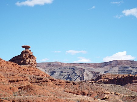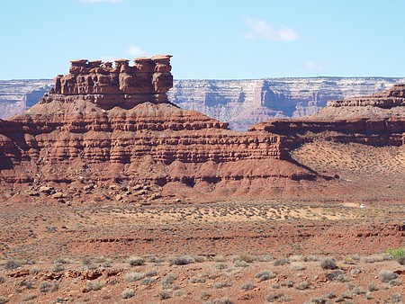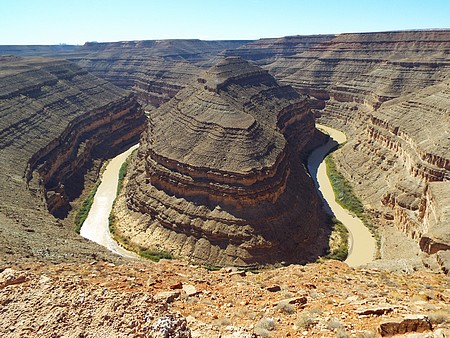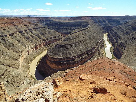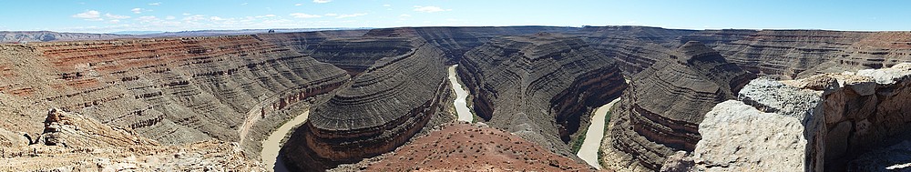 Hierna vervolgden we onze rit naar Monument Valley. We zagen de Mexican Hat Rock Formation maar ook de rotsen van Monument Valley al van ver. Vlak voor de plaats Mexican Hat reden we langs de Valley of the Gods, een Monument Valley in het klein. We zijn afgeslagen naar Goosenecks State Park. Iedereen gaat "en masse" naar Horseshoe Bend, maar hier in Goosenecks heb je een dubbele "bend", veel mooier dus en geen hordes toeristen. Je parkeert ook gewoon aan de rand. Heel mooi hier!